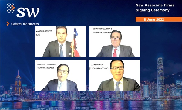 Mr. Edmundo Eluchans, Former Speaker of the Chilean House of Representatives and Senior Partner of Eluchans Abogados, together with Partner Mr. Guillermo Malatrassi, and Mr. Tsz-Hsin Shen commented, "We’re proud to be part of the SW network. Eluchans Abogados is well established in Chile with a long history of providing professional and high-quality legal services to local and international clients. Clients from Asia have been our key strategic focus for the development of our firm. As China continues to be one of the major drivers behind the global economic growth, we also strive to provide professional services for Asian clients who are looking to expand and grow in Chile. We look forward to creating more exciting opportunities in South America for clients all over the world.”